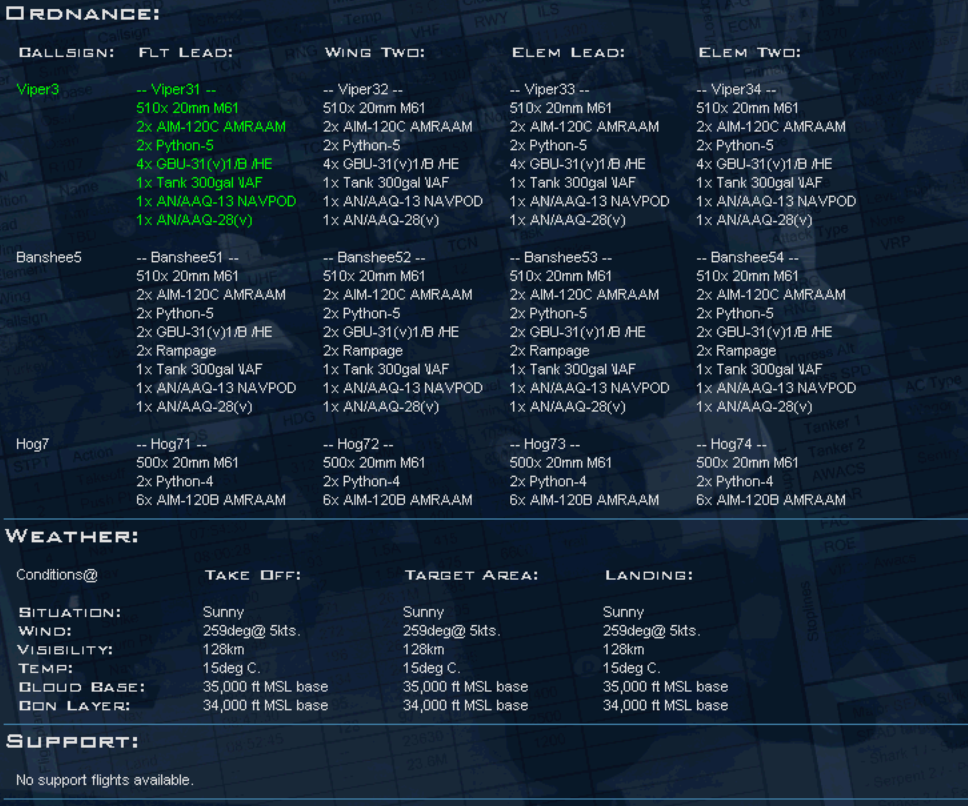 Flight Role: (SEAD, ESCORT, STRIKE, Etc..) Callsign11: "Pilot's name" AA=X AG=X RTB,MIA/KIA,EJT Callsign12: "Pilot's name" AA=X AG=X RTB,MIA/KIA,EJT Callsign13: "Pilot's name" AA=X AG=X RTB,MIA/KIA,EJT Callsign14: "Pilot's name" AA=X AG=X RTB,MIA/KIA,EJT