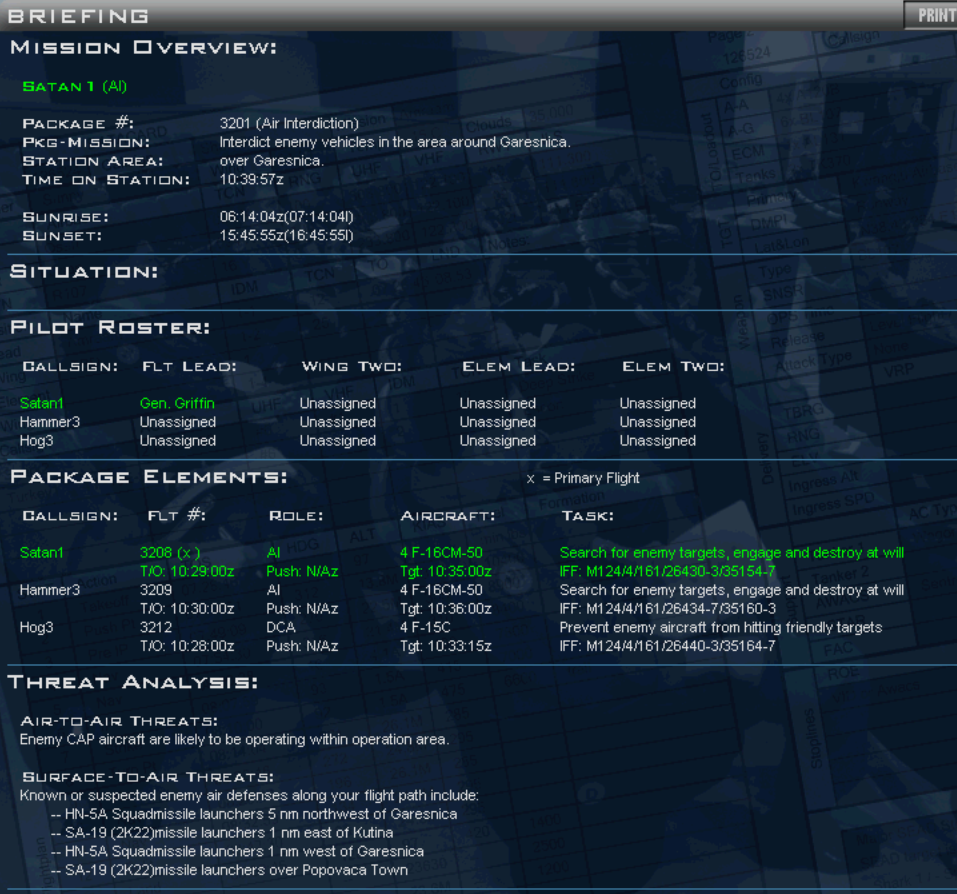 Flight Role: (SEAD, ESCORT, STRIKE, Etc..) Callsign11: "Pilot's name" AA=X AG=X RTB,MIA/KIA,EJT Callsign12: "Pilot's name" AA=X AG=X RTB,MIA/KIA,EJT Callsign13: "Pilot's name" AA=X AG=X RTB,MIA/KIA,EJT Callsign14: "Pilot's name" AA=X AG=X RTB,MIA/KIA,EJT