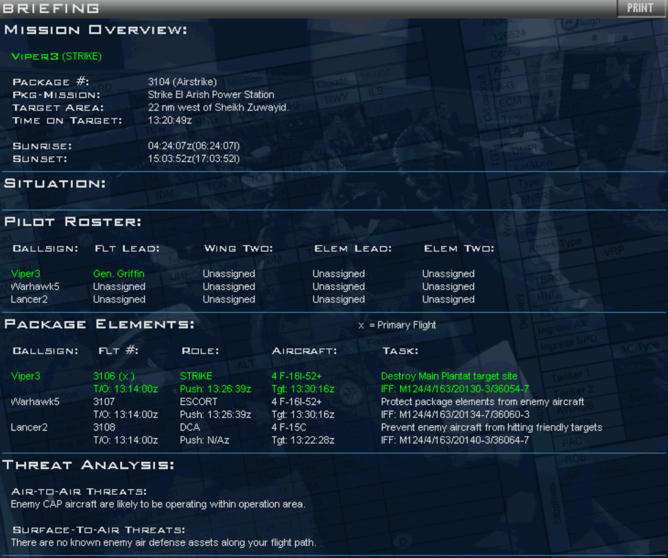 Flight Role: (SEAD, ESCORT, STRIKE, Etc..) Callsign11: "Pilot's name" AA=X AG=X RTB,MIA/KIA,EJT Callsign12: "Pilot's name" AA=X AG=X RTB,MIA/KIA,EJT Callsign13: "Pilot's name" AA=X AG=X RTB,MIA/KIA,EJT Callsign14: "Pilot's name" AA=X AG=X RTB,MIA/KIA,EJT