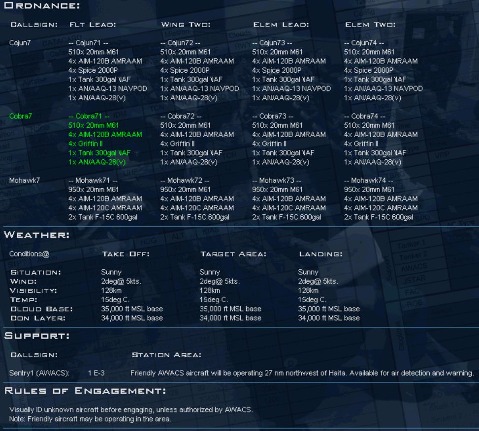 Flight Role: (SEAD, ESCORT, STRIKE, Etc..) Callsign11: "Pilot's name" AA=X AG=X RTB,MIA/KIA,EJT Callsign12: "Pilot's name" AA=X AG=X RTB,MIA/KIA,EJT Callsign13: "Pilot's name" AA=X AG=X RTB,MIA/KIA,EJT Callsign14: "Pilot's name" AA=X AG=X RTB,MIA/KIA,EJT