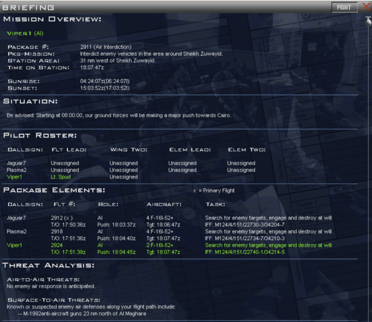 Three flights of F-16s are scheduled to depart in the early evening. It is advised that one flight provides overwatch while the others commit to ground attacks. Although no air resistance is expected, sensible caution is advised.