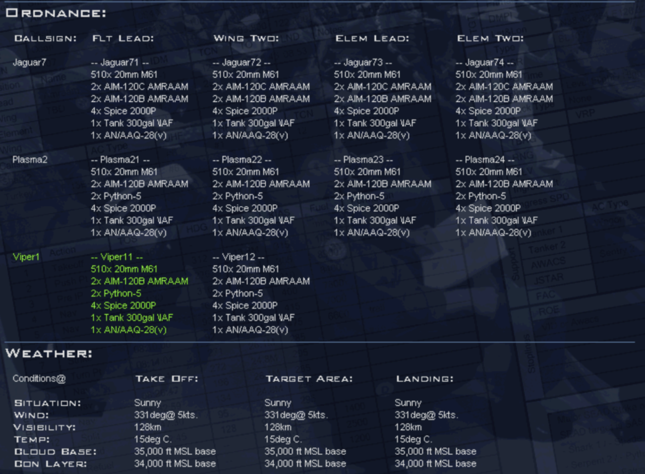 Flight Role: (SEAD, ESCORT, STRIKE, Etc..) Callsign11: "Pilot's name" AA=X AG=X RTB,MIA/KIA,EJT Callsign12: "Pilot's name" AA=X AG=X RTB,MIA/KIA,EJT Callsign13: "Pilot's name" AA=X AG=X RTB,MIA/KIA,EJT Callsign14: "Pilot's name" AA=X AG=X RTB,MIA/KIA,EJT